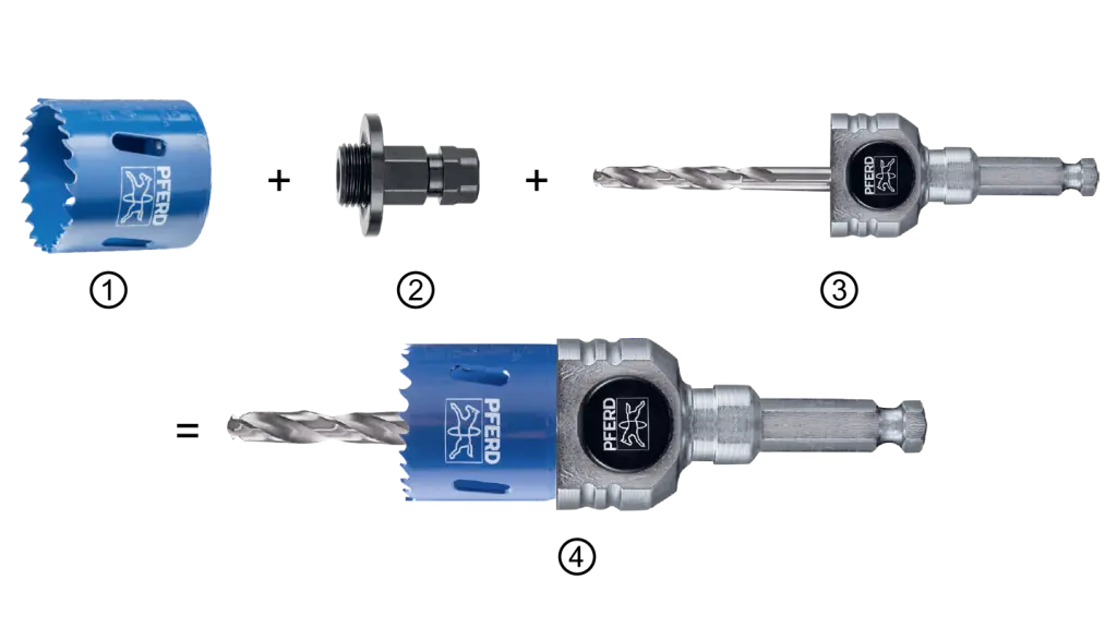 PFERD TOOLS offers a special quick-mounting system to ensure quick and easy use of HSS hole saws. After use, the hole saw and quick-mounting system can be separated by simply pressing a button.